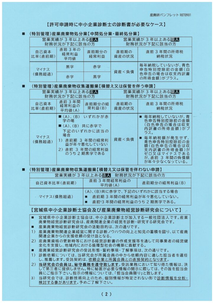 産業廃棄物処理業では、許可申請(新規・更新・事業範囲の変更許可)の際に経理的基礎の有無を判断するため、財務状況によっては中小企業診断士が作成する診断書の提出が必要となっています